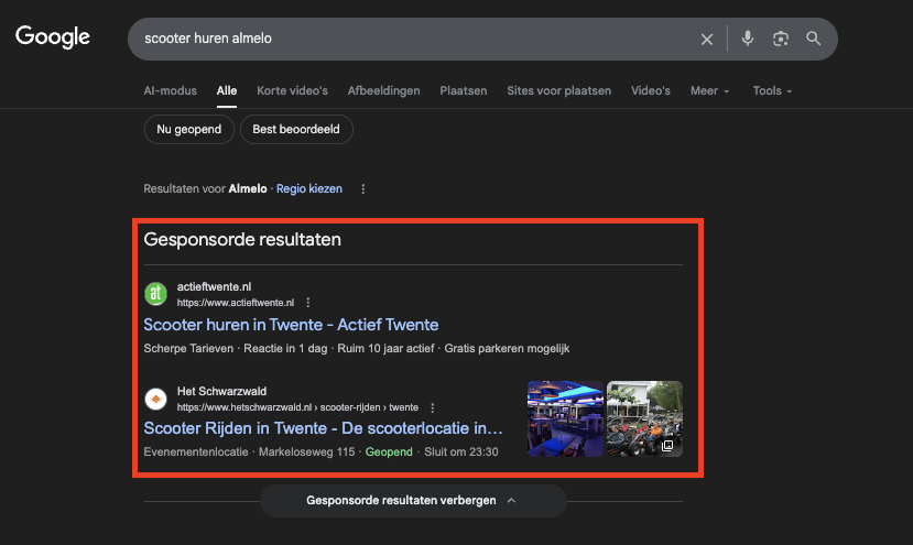 De bekendste en belangrijkste vorm van SEA is search advertenties. Met deze advertenties zorg je ervoor dat jouw website bovenaan staat wanneer de gebruiker zoekt op specifieke zoekwoorden. Heb jij bijvoorbeeld een bedrijf dat scooters verhuurt aan toeristen in Almelo? Dan wil je dat jouw website boven je concurrenten staat wanneer iemand zoekt op “scooter huren almelo” of “activiteiten almelo”.